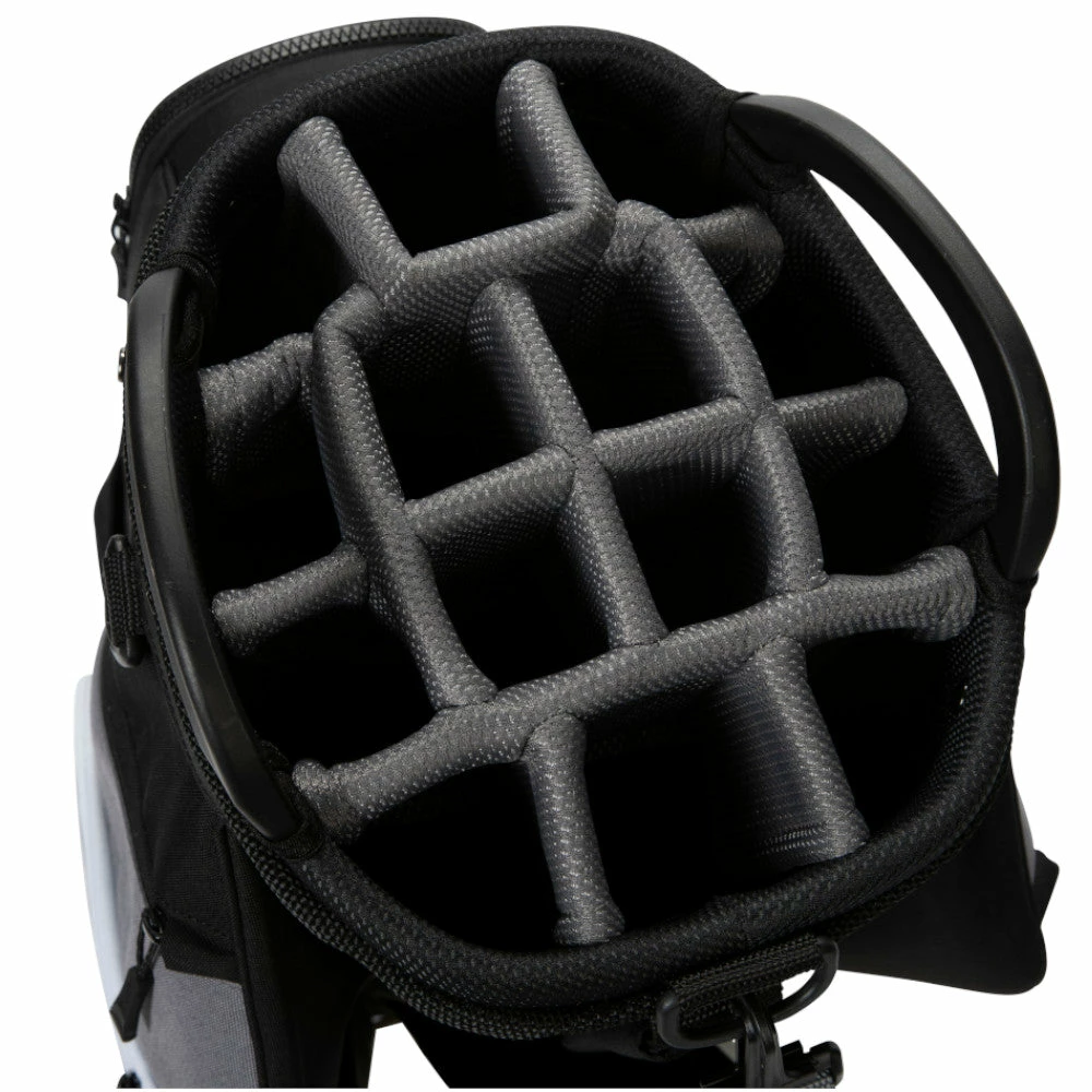 14-way divided with 3 full-length dividers, it offers plenty of space for club organisation, with included rain hood for club protection in adverse weather conditions. 11 total pockets offer space for valuables, accessories, garments and more, with a pass-thru strap for easy cart attachment.